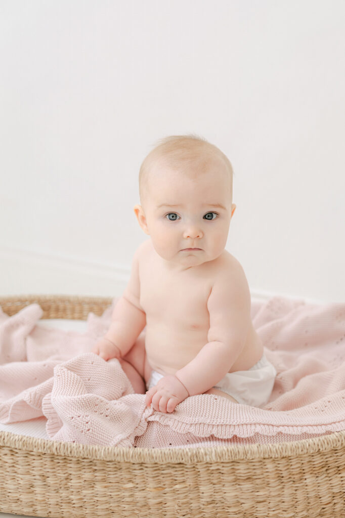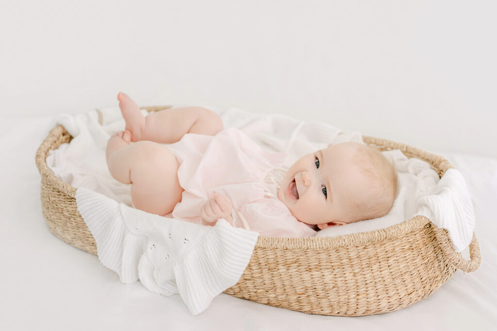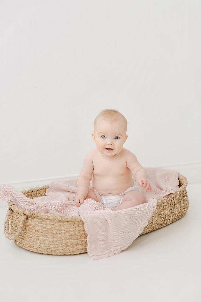 This is probably my favorite solo image to capture for the sitter session. I love watching them hold their feet or just wiggle them in the air and grin up at you. If you’re lucky you’ll get a little tongue sticking out like Lowen gave us. Adding a basket gives us variety.