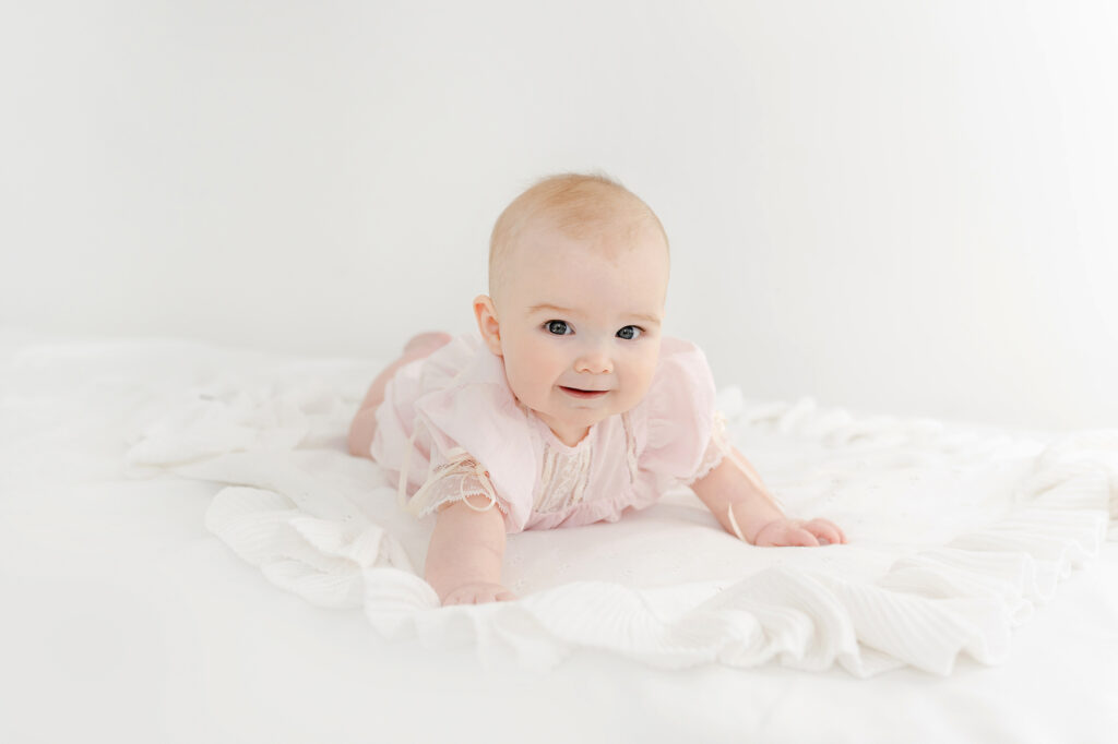 6 month old babies are pro’s at tummy time and are able to hold their heads up long enough to get some great shots. They do get tired quickly so this pose isn’t one you can keep them in for long.