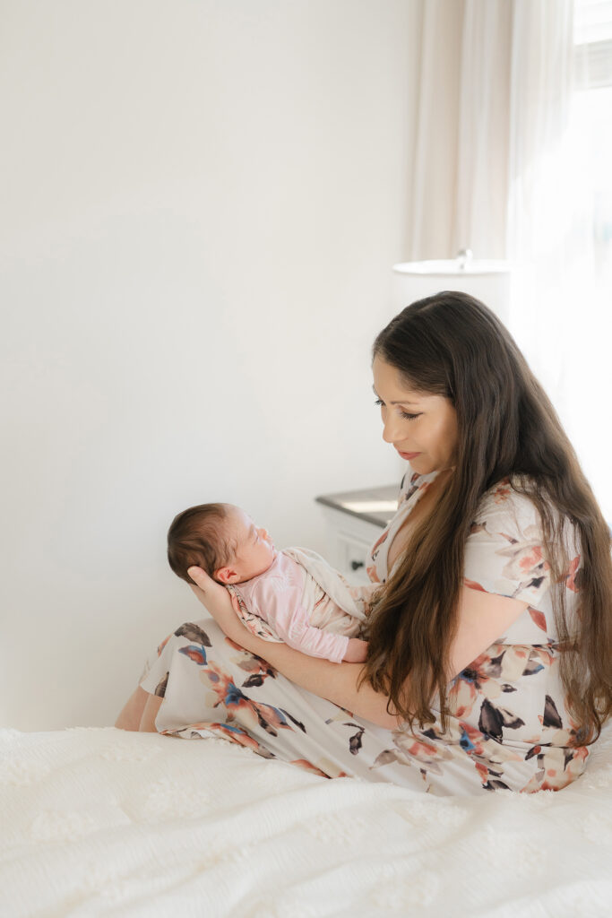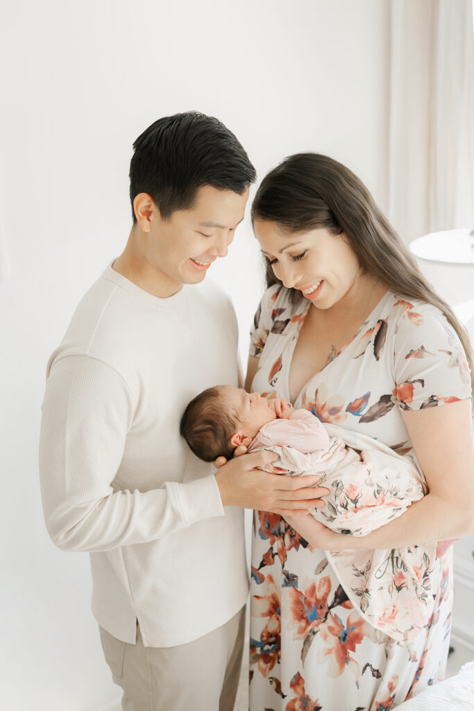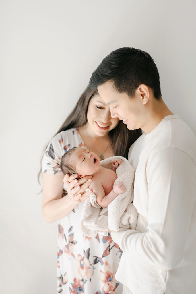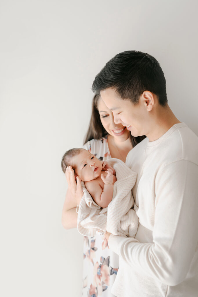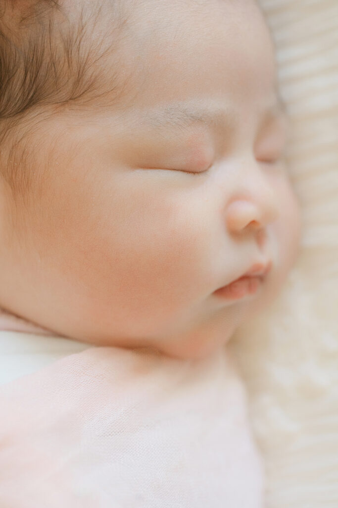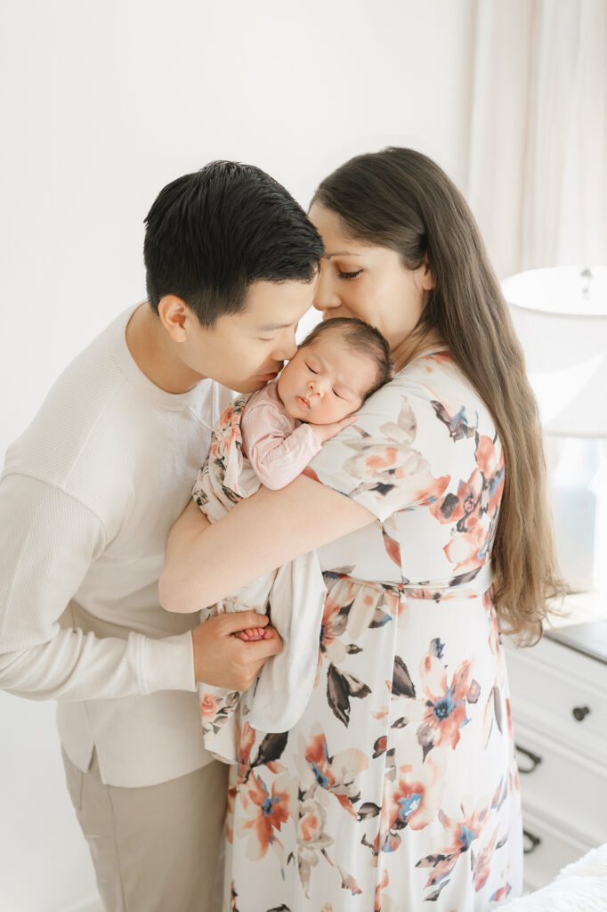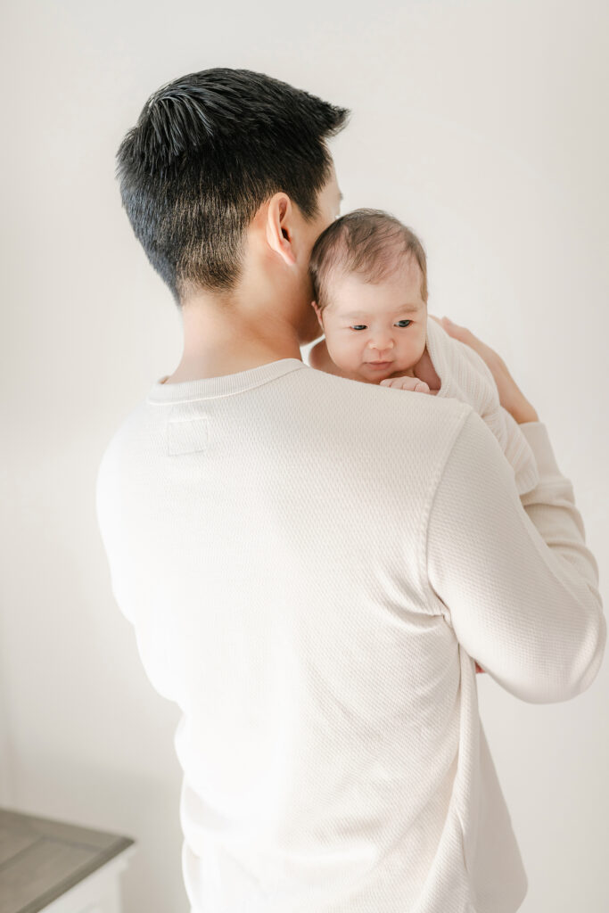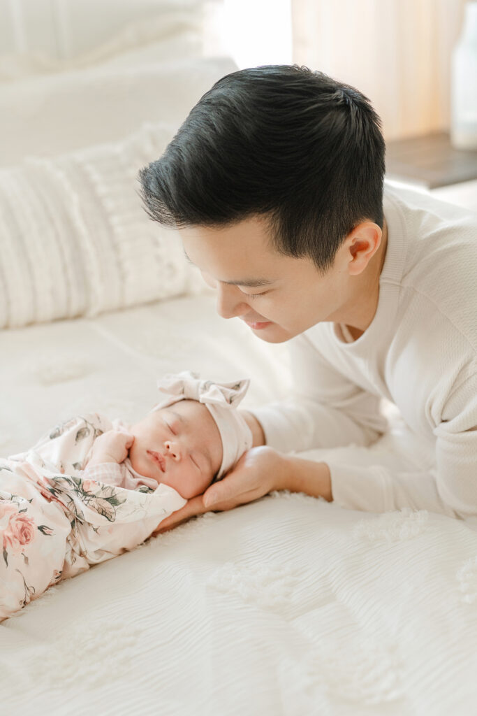 Home newborn sessions focus on real moments rather than posed perfection. Some of the sweetest photos from the Hwang family session came from simply watching them care for their baby – gentle rocking, tiny hand holds, and quiet whispers.