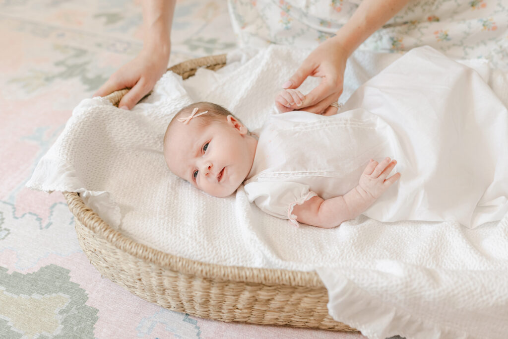 • We move through setups gently. Wrapped poses, basket setups, parent holds. Whatever works for your baby that day.