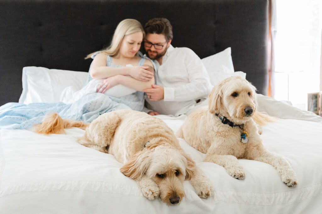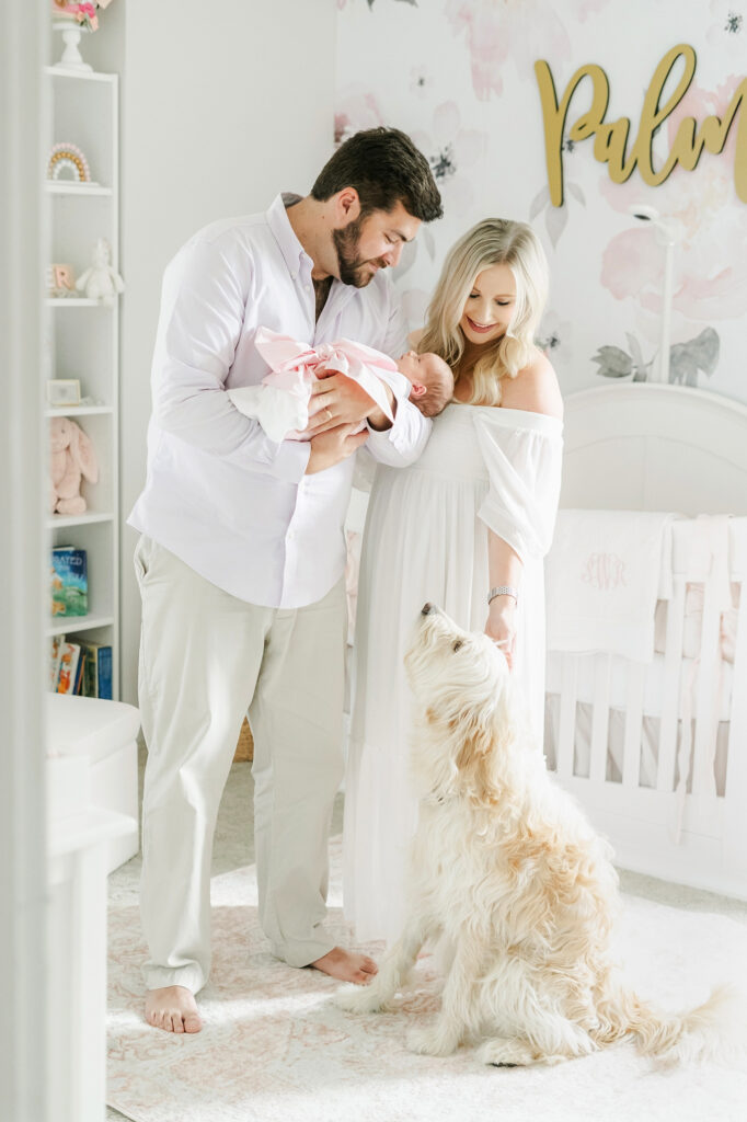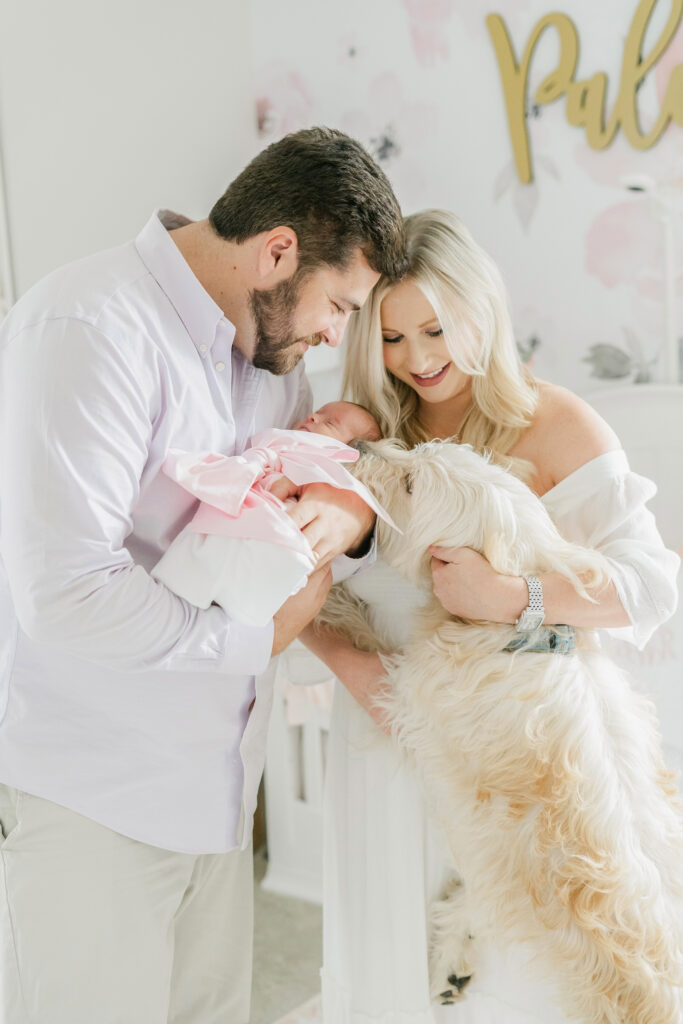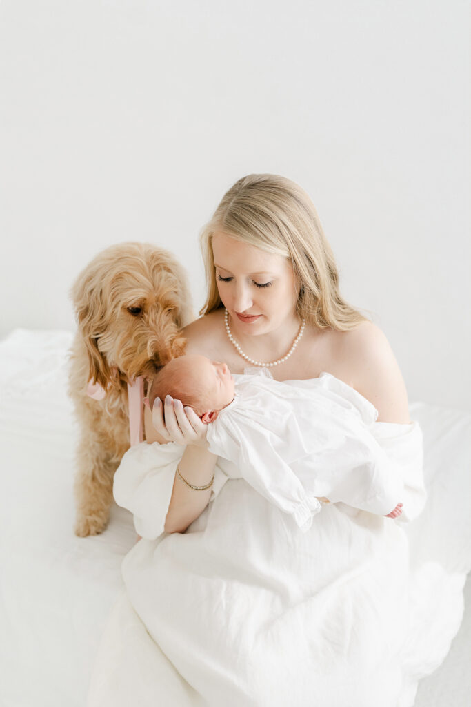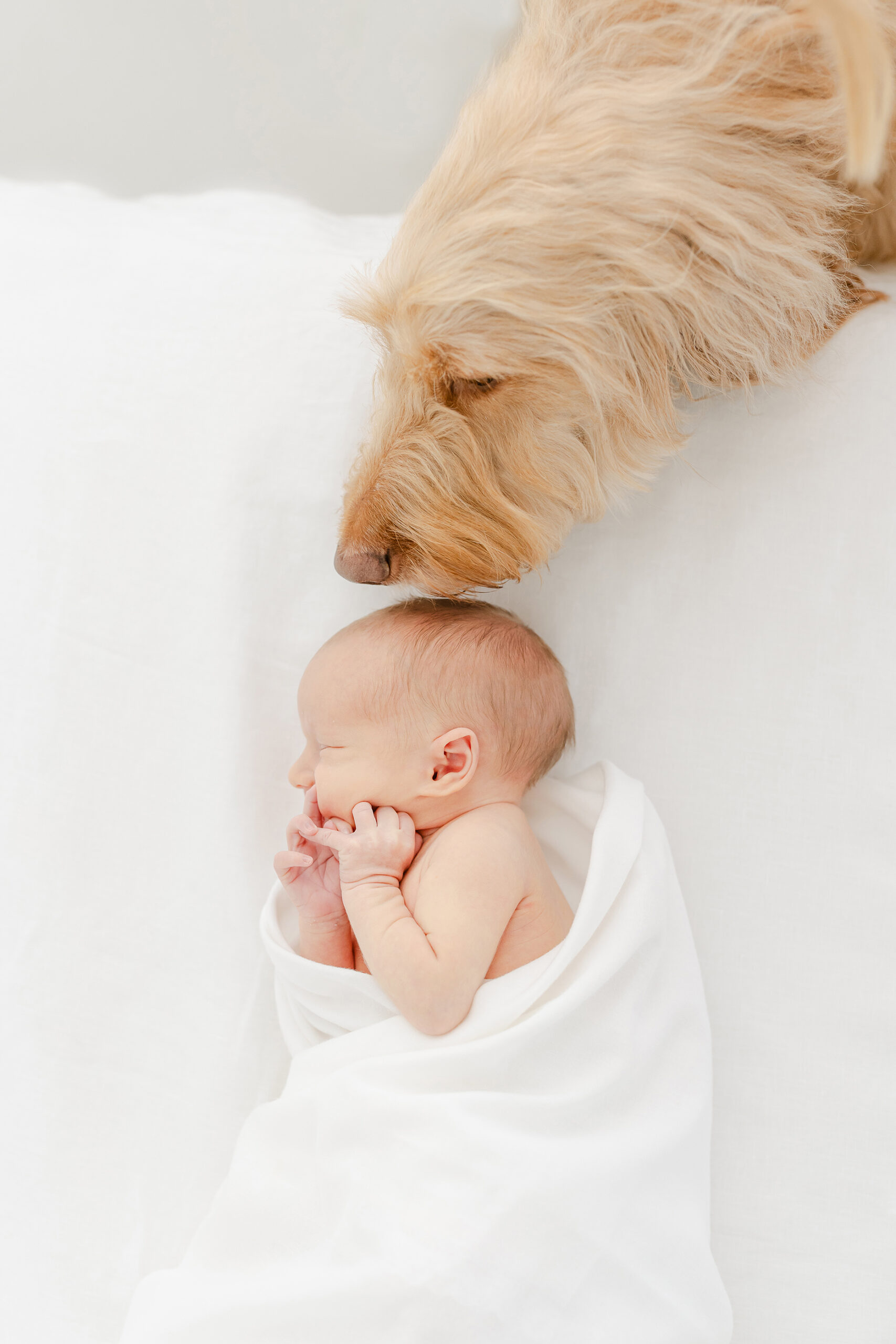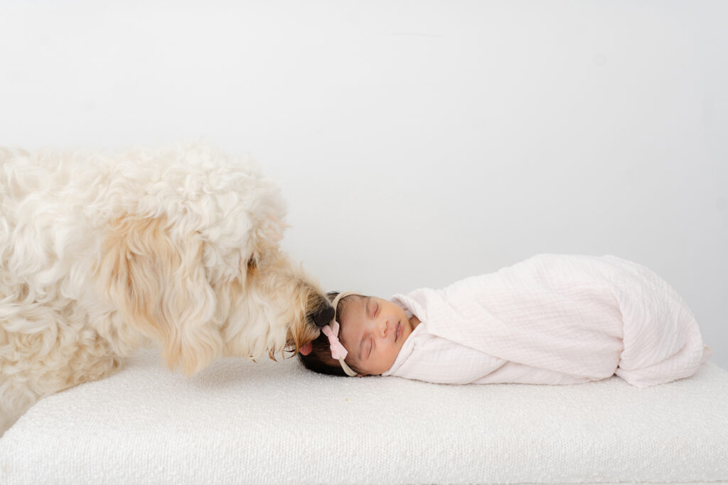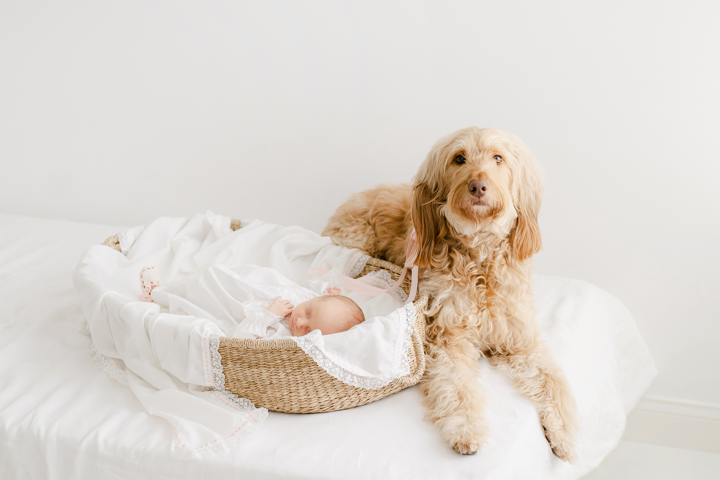 The full newborn session runs around 2 hours but we’ll only include your dog for a small portion (15-30 minutes max). This keeps stress low for both your baby and pet.