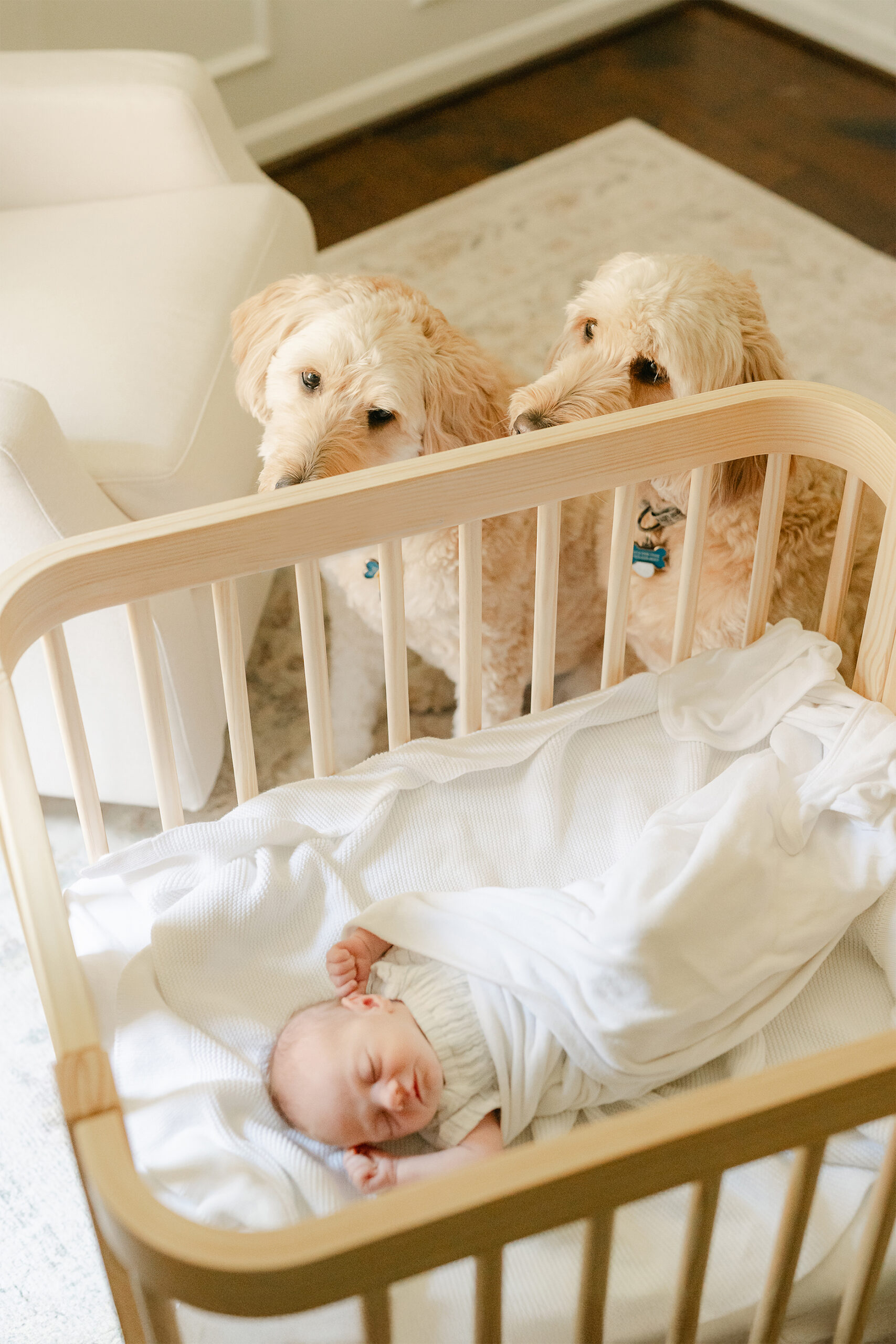 Timing is key when planning photos with your newborn and furry friend. I suggest booking your session when your baby is 5-12 days old. During this window, babies are still sleepy and curl up in those adorable poses we all love. If you have an active dog a sleepy baby will, also, make things much easier.
