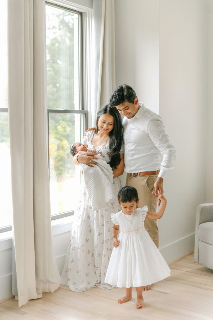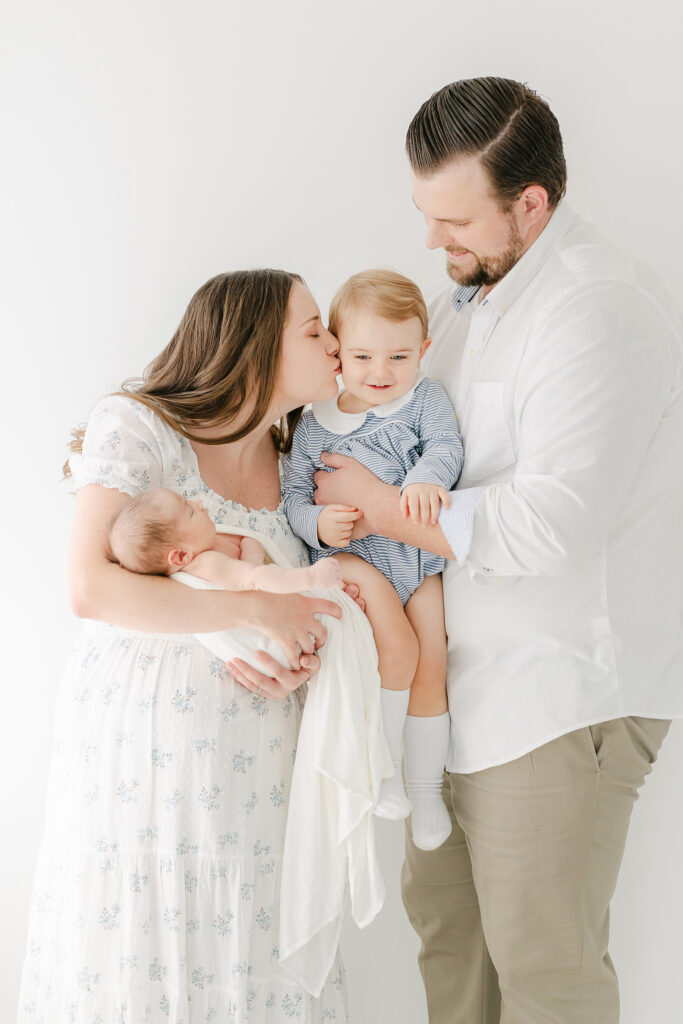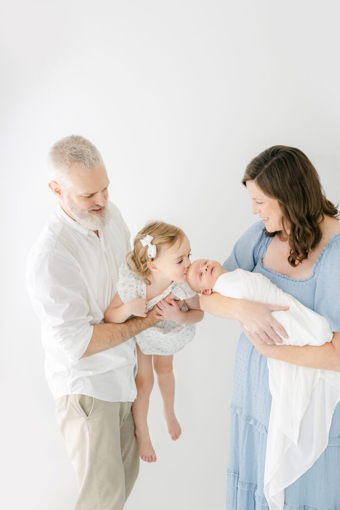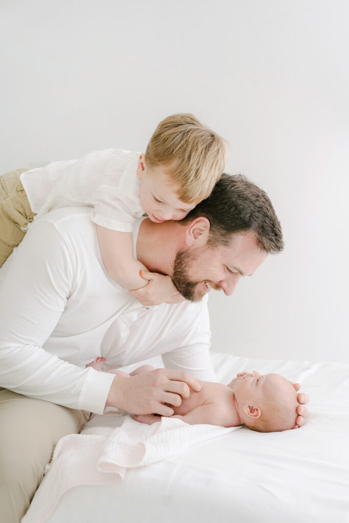 Even with unpredictable toddler behavior, we’ll capture beautiful results. I’ve seen it all – from the toddler who wants nothing to do with baby brother to the overly enthusiastic sister who can’t stop kissing (or squeezing. The real magic happens in those unplanned moments – a curious toddler peeking at baby’s tiny toes, or the split-second when your older child gently holds their sibling’s hand. These are the images families treasure most.